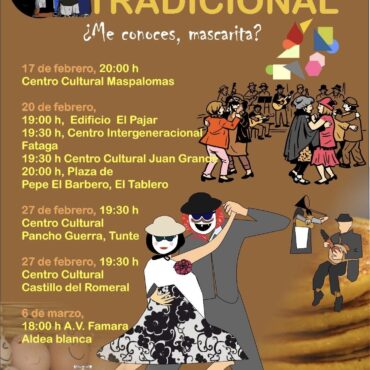 Un recorrido por los distintos núcleos del municipio para compartir tradición, identidad y encuentros intergeneracionales en nuestros centros culturales.Programación: 17 Febrero 20:00 h - Centro Cultural Maspalomas20 Febrero 19:00 h - Edificio El Pajar19:30 h - Centro Intergeneracional Fataga19:30 h - Centro Cultural Juan Grande20:00 h - Plaza de Pepe El Barbero, El Tablero27 Febrero 19:30 h - Centro Cultural Pancho Guerra (Tunte)19:30 h - Centro Cultural Castillo del Romeral6 […]